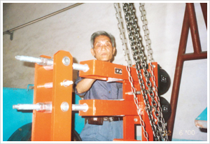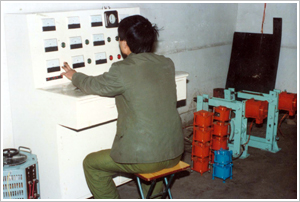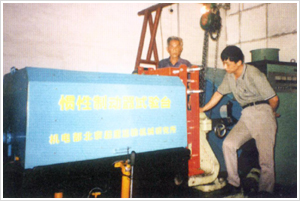 節(jié)能制動器創(chuàng)始人張家政先生(左一)在北京起重運(yùn)輸機(jī)械研究所實(shí)驗(yàn)臺上進(jìn)行檢測